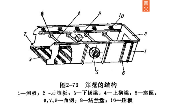 圖2-73是雙層單軸慣性振動篩的篩框結(jié)構(gòu)。它是由側(cè)板1、后擋板2、下橫梁3和上橫梁4組合而成。側(cè)板是用鋼板制成,利用橫梁將兩塊側(cè)板連接起來,使篩框成整體結(jié)構(gòu)。側(cè)板用以傳遞激振力,在它的中部,鉚接有座圈5,激振器就安裝在座圈內(nèi)。為了加強(qiáng)側(cè)板的剛度,在座圈附近采用雙層的鋼板,并在適應(yīng)部位鉚接角鋼6以補(bǔ)強(qiáng)。下橫梁采用槽鋼,上橫梁用無縫鋼管,并用角鋼7和法蘭盤8分別鉚接在側(cè)板上。上層篩面放置在側(cè)板內(nèi)側(cè)的角鋼上,并用壓板10和木楔塊將它固緊。下層篩網(wǎng)放置在下橫梁上,用卡板拉緊(圖2-77)。后擋板中間有能拆卸的后蓋板,供清洗或檢查篩面用。